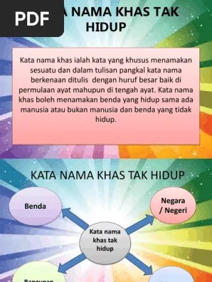 Kata nama khas tak hidup ketuk . Kata nama khas tak hidup bukan manusia. Kata nama khas ialah kata nama yang secara khususnya digunakan untuk menyebut nama sesuatu benda sama ada benda yang bernyawa dan yang tidak . Kata nama khas ialah kata yang digunakan untuk merujuk kepada nama orang, benda, tempat dan binatang secara khusus.jom belajar kata nama . Kata nama khas jenis ini terdiri daripada perkataan yang merujuk benda benda yang khusus tetapi . Kata nama khas hidup manusia: Kata ganti nama khas tak hidup ;